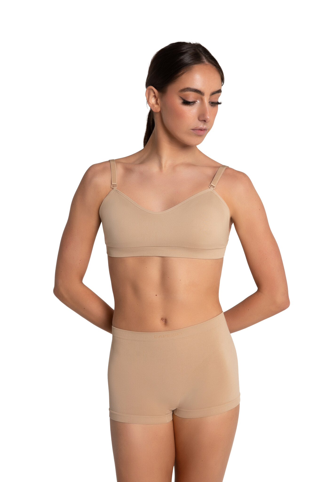 This bandeau bra provides concealed support with a maximum open-back feel. Features a flattering sweetheart neckline, sewn-in cups, and a clear back strap that will not distract when worn under leotards or costumes.