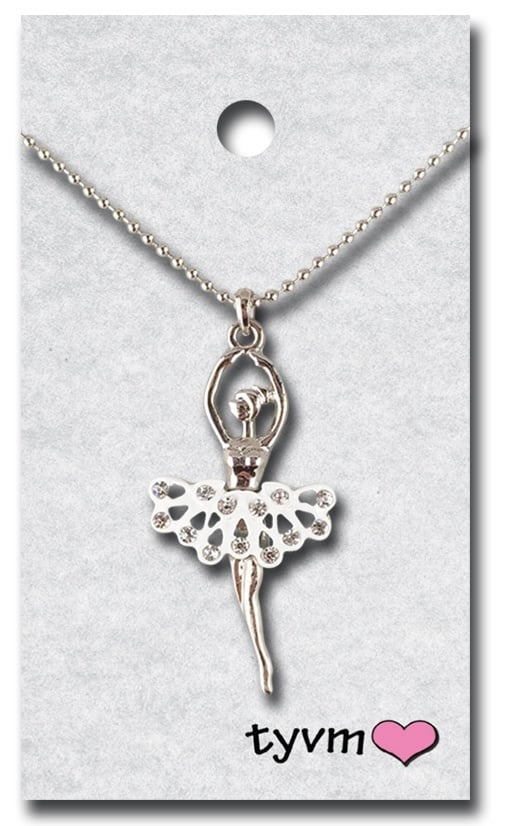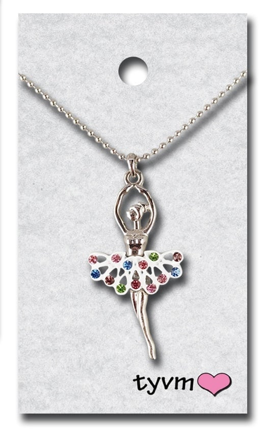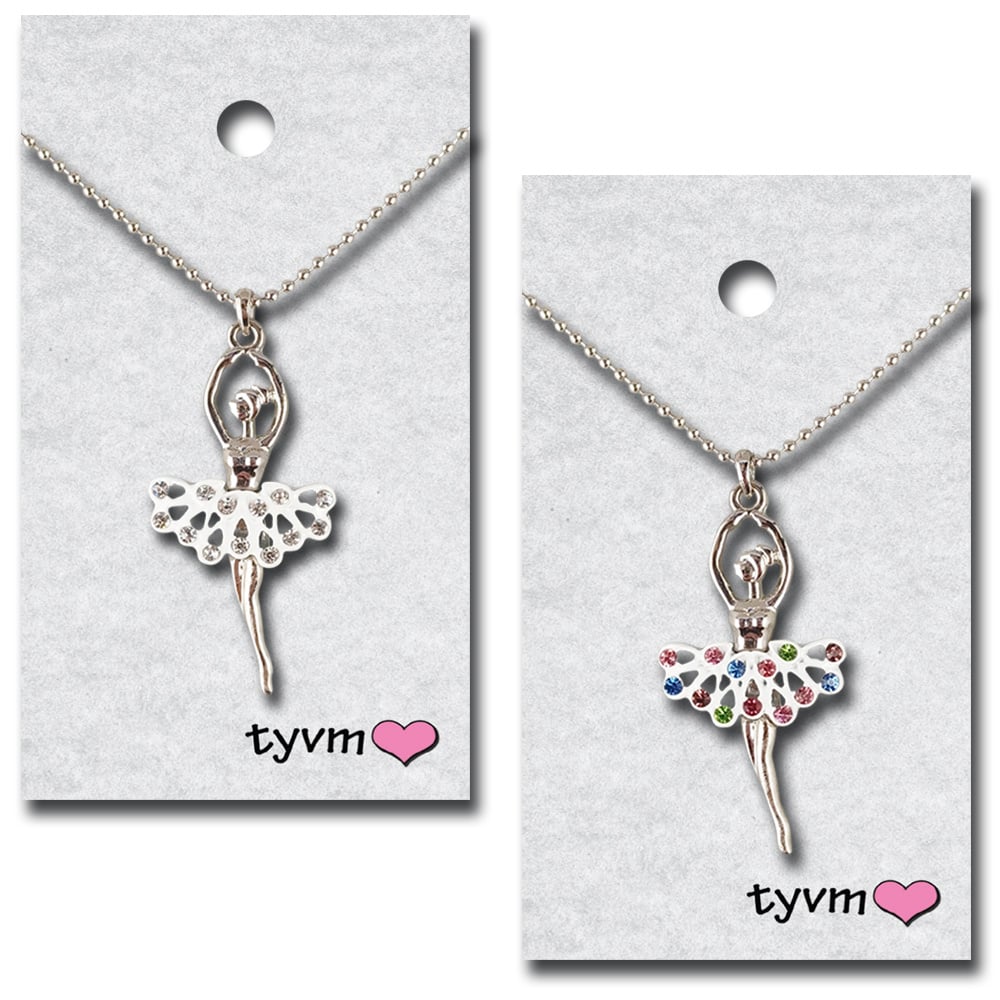 Create an accountThe necklaces are beautiful ballerinas with crystal in their skirts. There is great detail in the charm and they are of high quality craftsmanship. The necklace is available in silver with clear or rainbow stones.